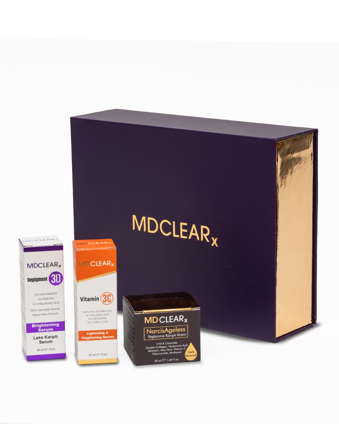 Bu set; cilt tonu eşitsizliği, elastikiyet kaybı ve mat görünüm gibi yaşlanma belirtilerine karşı birlikte ve doğru sırayla kullanılmak üzere tasarlanmıştır.